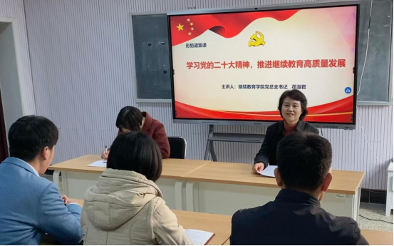 为深入学习宣传党的二十大精神,加强学院师生党性修养,11月18日下午,学院党总支书记茌淑君以“学习党的二十大精神,推进继续教育高质量发展”为题为探花 师生讲授形势政策课