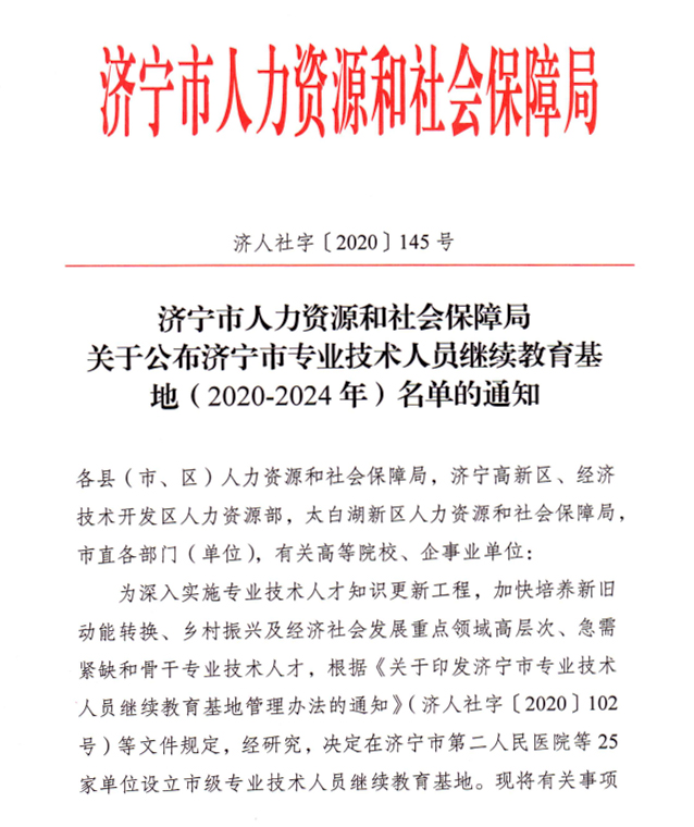 近日,《济宁市人力资源和社会保障局关于公布济宁市专业技术人员继续教育基地( 2020-2024年)名单的通知》(济人社字[2020]145号)已经下发,曲阜师大探花