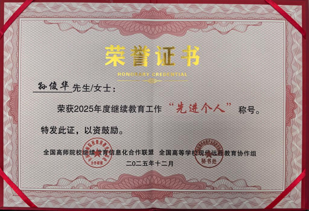 凭借扎实办学成效、鲜明特色优势及显著创新成果,获评“2025年度继续教育工作先进集体”, 学院孙俊华同志荣获“先进个人”称号,这是联盟对探花