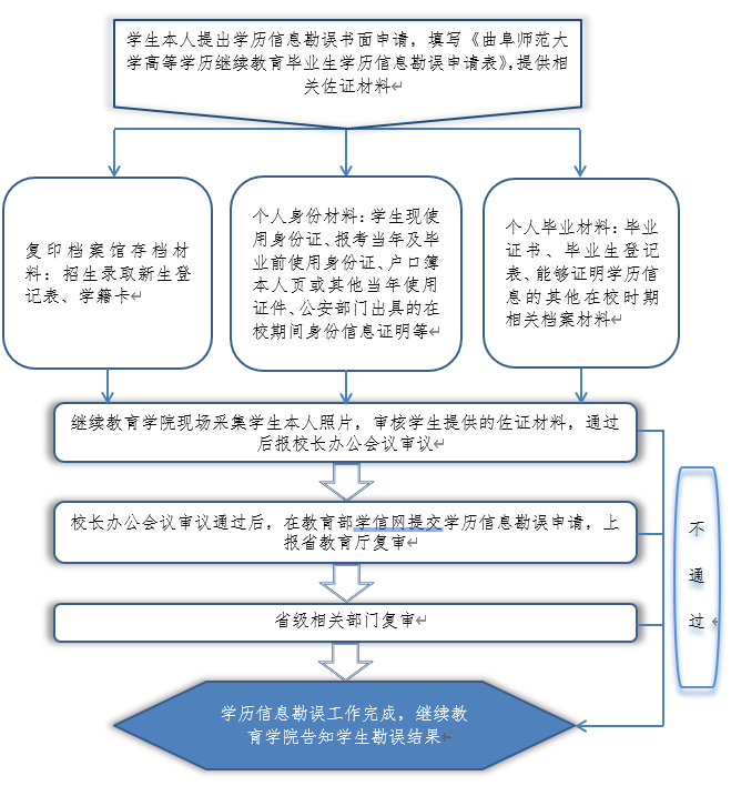 成人高等教育毕业生如学历信息有误可进行勘误,请将有关材料按照要求提交至探花 教务部协助进行学历勘误,具体流程如下: