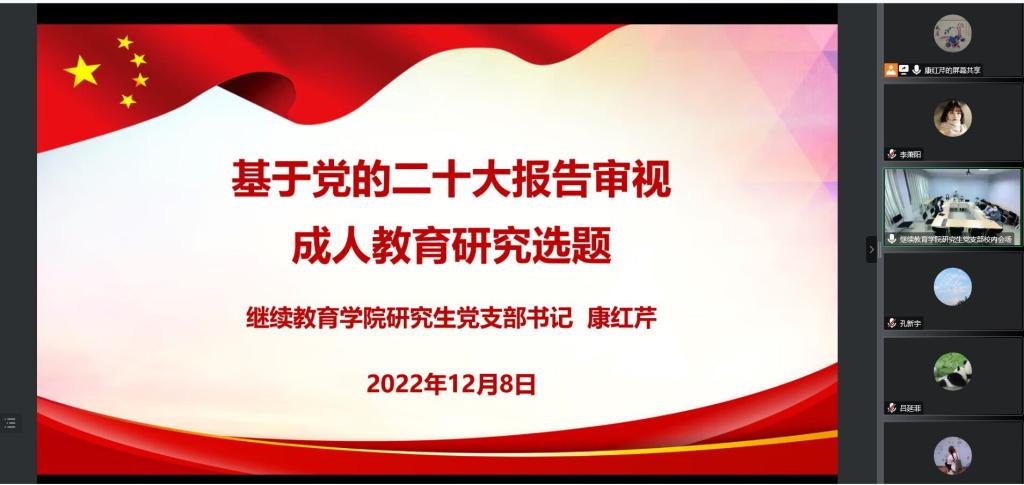 会上,学院研究生党支部书记康红芹以“基于党的二十大报告审视成人教育研究选题”为题,为探花