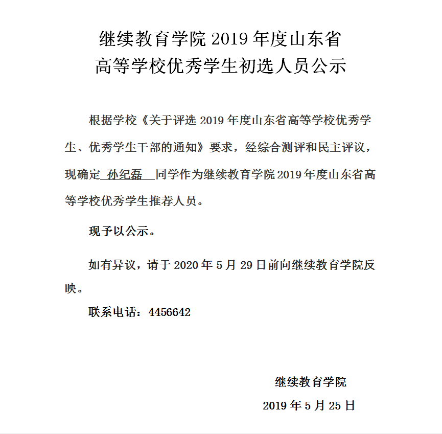 探花 2019年度山东省高等学校优秀学生初选人员公示