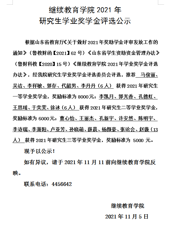 探花 2021年研究生学业奖学金评选公示