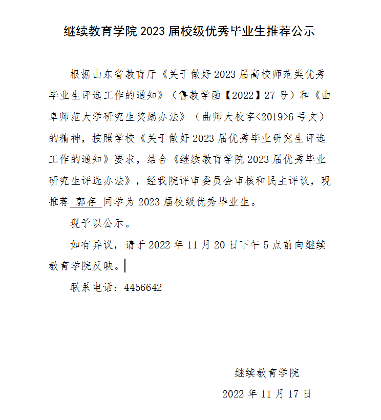 探花 2023届校级优秀毕业生推荐公示