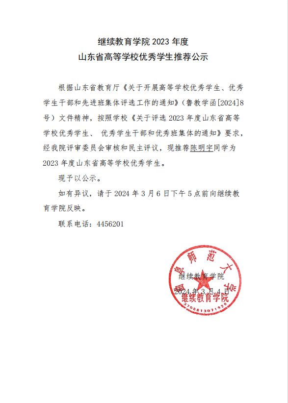 探花 2023年度山东省高等学校优秀学生推荐公示