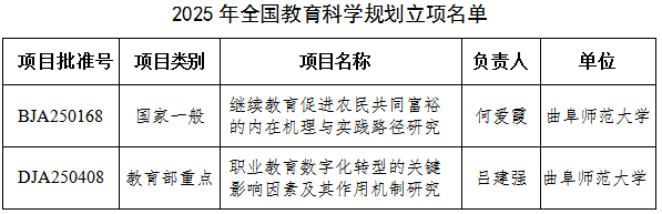 成功获批2个项目,在全国教育科学规划项目申报中再创佳绩。何爱霞教授主持的“继续教育促进农民共同富裕的内在机理与实践路径研究”获批全国教育科学规划国家一般项目(项目批准号:BJA250168),吕建强副教授主持的“职业教育数字化转型的关键影响因素及其作用机制研究”获批全国教育科学规划教育部重点项目(项目批准号:DJA250408)。